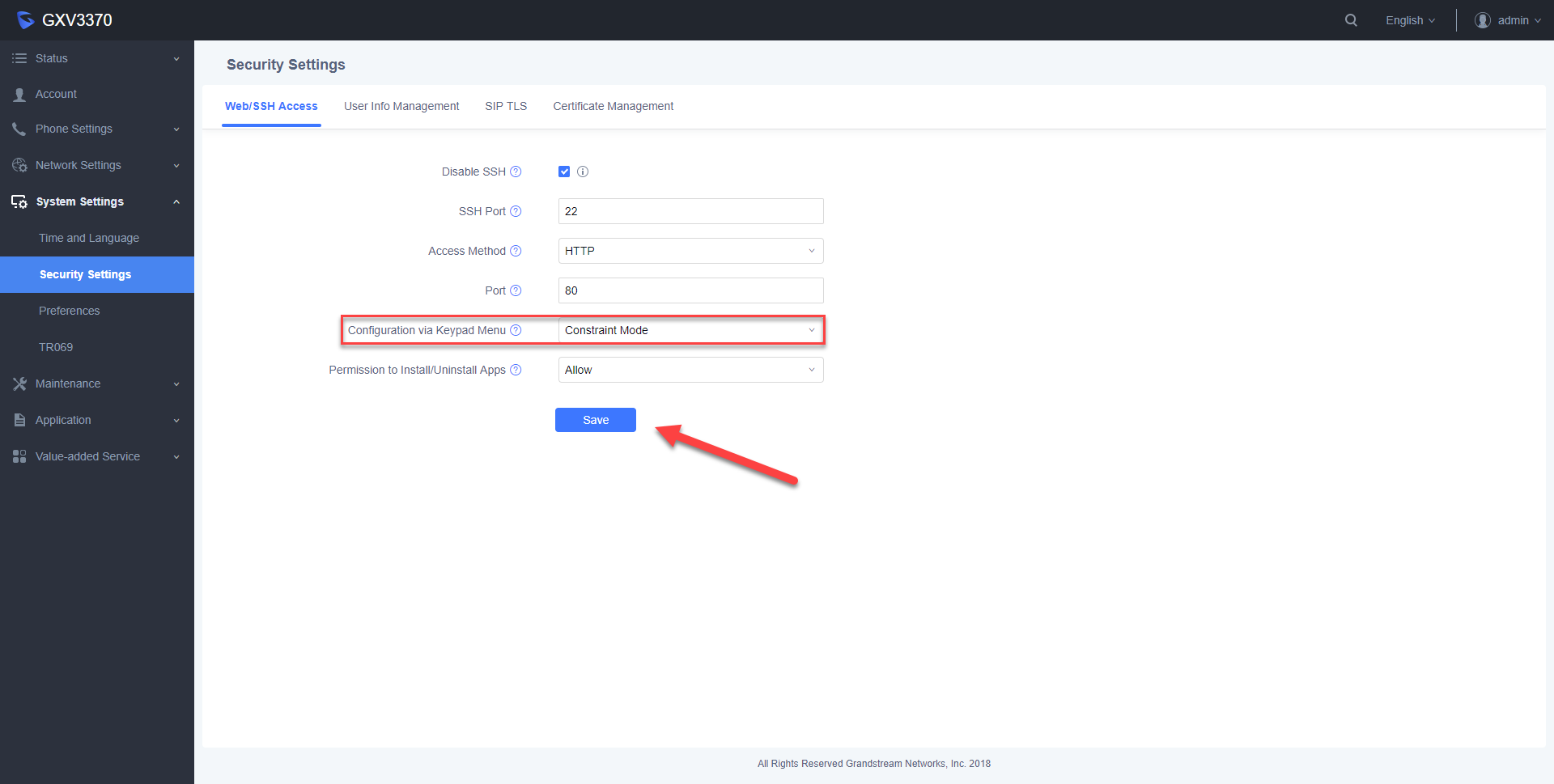 - Once the configuration has been verified, to disable configuration changes via the touch screen, Click on System Settings --> Security Settings --> WEB/SSH. Set the Configuration via Keypad Menu to Constraint Mode, and click save.