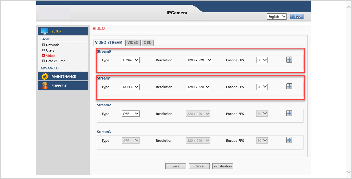 - Set the H.264 and the MJPEG settings to 1280x720.