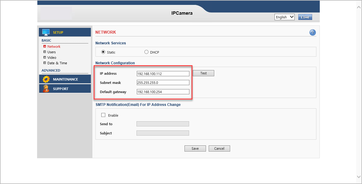 - Set IP address for IP Camera (Static address highly suggested), In this example, we set the camera to 192.168.100.112.