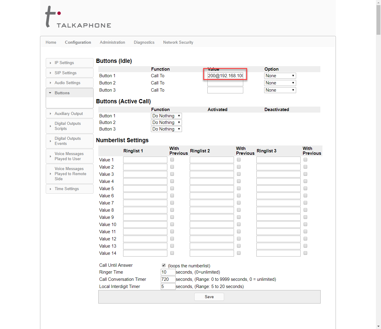 - Assign the AVM-1 to be called when button is pressed on the VOIP-20X, by entering the SIP User ID that will be assigned to the AVM-1 (GXV3370) and the IP address of the AVM-1 (GXV3370) with the format SIPUserID@IPAddress