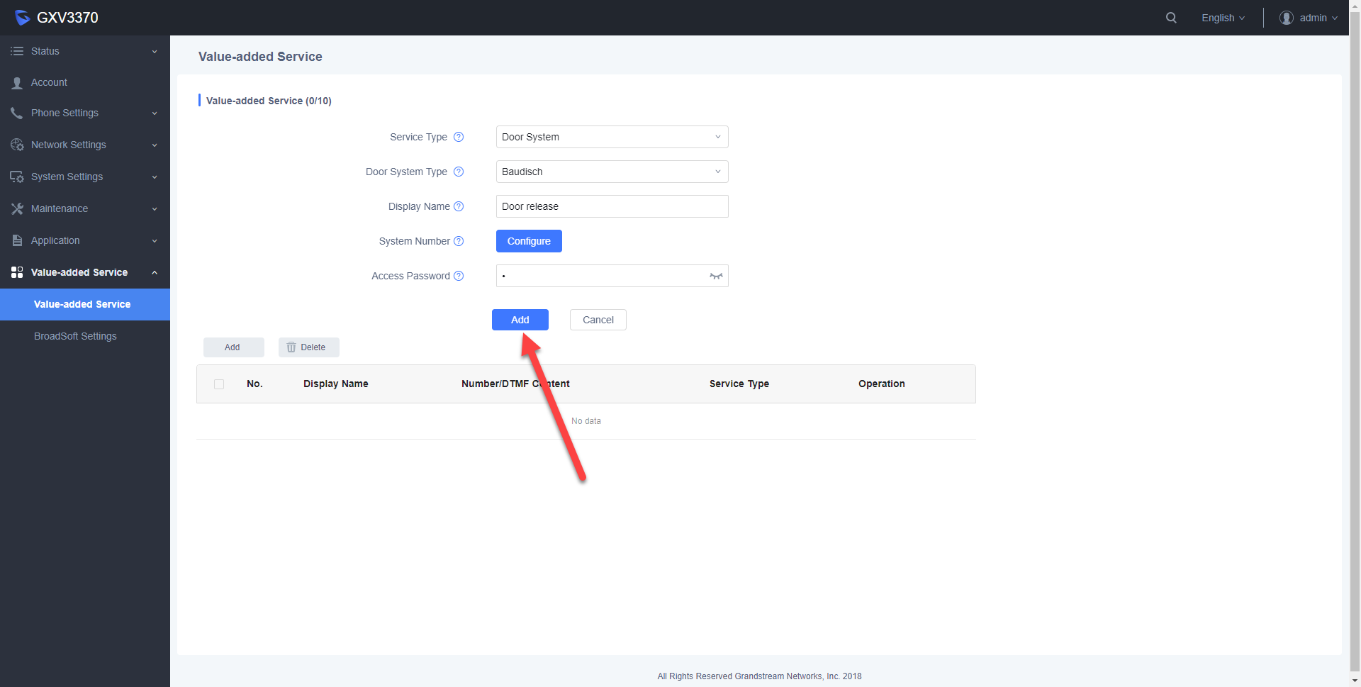 - Click on the Value-added Service item in the left hand navigation. Then click on Add.
